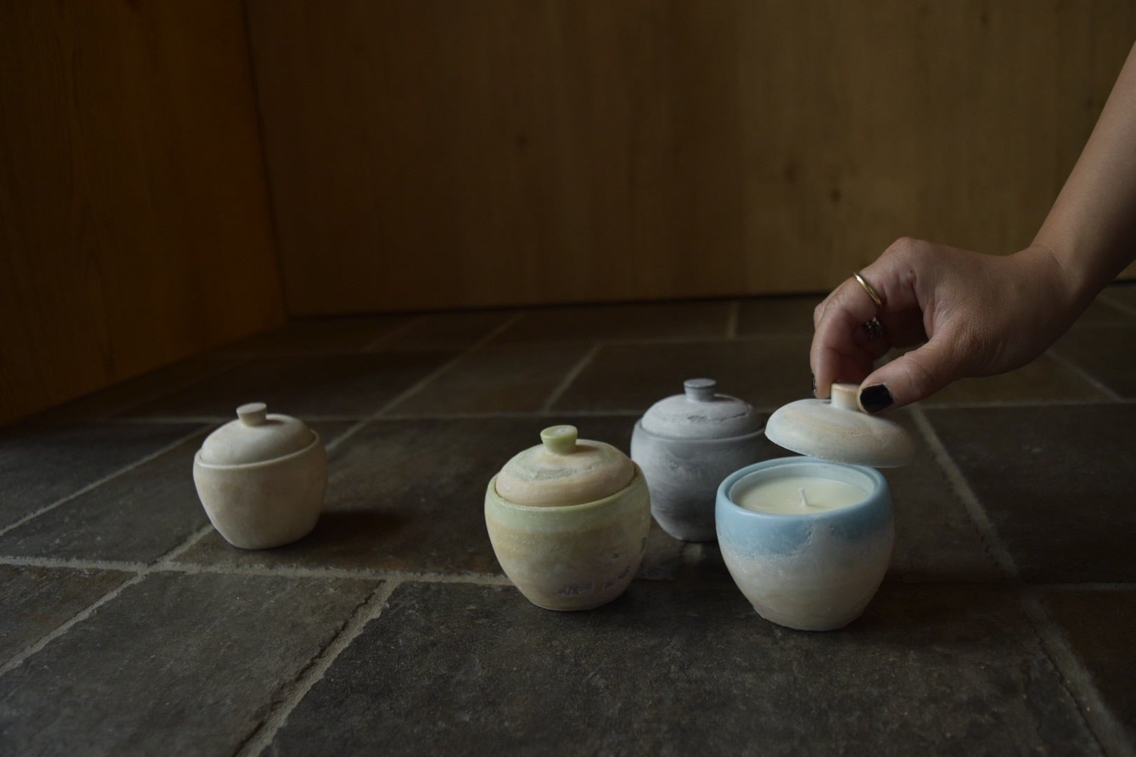 ”Tou-トウ-“ 灯・問 Touはやさしい灯りであり、ご自身に問い 大切なひとときを過ごすための蝋燭です。 蝋燭を灯すとき。 今のご自身の記憶や感情にそっと寄り添い 静かに向き合えたり。活力になれたり。 大切な1日を過ごすきっかけになれたらと思い、 4種類の香りを作成いたしました。 まるで素焼きな器のような佇まい。 私自身が素焼きの質感が好きで。 素焼きのようにマットな質感は、あたたかな手触りと 土のぬくもりを感じさせてくれます。 香り付けは精油を使用しております。 それぞれ3種類の精油をテーマに併せてブレンドしてみました。 器の部分も全て植物由来の天然の蝋で作成しております。 周りはヤシの実から抽出されるパームワックス。 中身は大豆由来のソイワックスに 精油で香り付けを行ないました。 記憶や感情と向き合えるような香り箱。 こだわりの質感の蝋燭。 ぜひ、直接お手に取って頂きたいです。 こちらの蝋燭の質感や色の出方は一点一点かなり違いがございますのでご了承くださいませ。 まるで本物のような焼き物が再現できました。 以下香りのご案内です。 ____________________________________________ ・15 翔日-ショウジツ- 振り返る暇もなく駆け抜ける日々。 トップノート;ティーツリー ミドルノート;ベルガモット、シダーウッド 呼吸を深め、また走り出すためのフレッシュなブレンド。 ・24 静灯-セイトウ- 静かな香りと灯りがそっと心に寄り添う トップノート;イランイラン ミドルノート;ネロリ、サンダルウッド 静けさをまとい、感情に寄り添うひとときを。 ・30 開路-カイロ- 自分の道を切り開いていく。 トップノート;フランキンセンス ミドルノート;クローブ、ミルラ 意志を灯し、迷わず進むための香り。 ・96 -慣志-カンシ- 厳しさの中に静かなやさしさが宿る。 トップノート;サンダルウッド ミドルノート;ネロリ、ベルガモット ご自身感情や想いに向き合いたい時に。 ALL ¥4,180 素材 器部分 パームワックス 中の部分 ソイワックス 燃焼時間 約8時間 直径約7,5cm 高さ(蓋込み)8cm オリジナルの箱つき _________________________________________