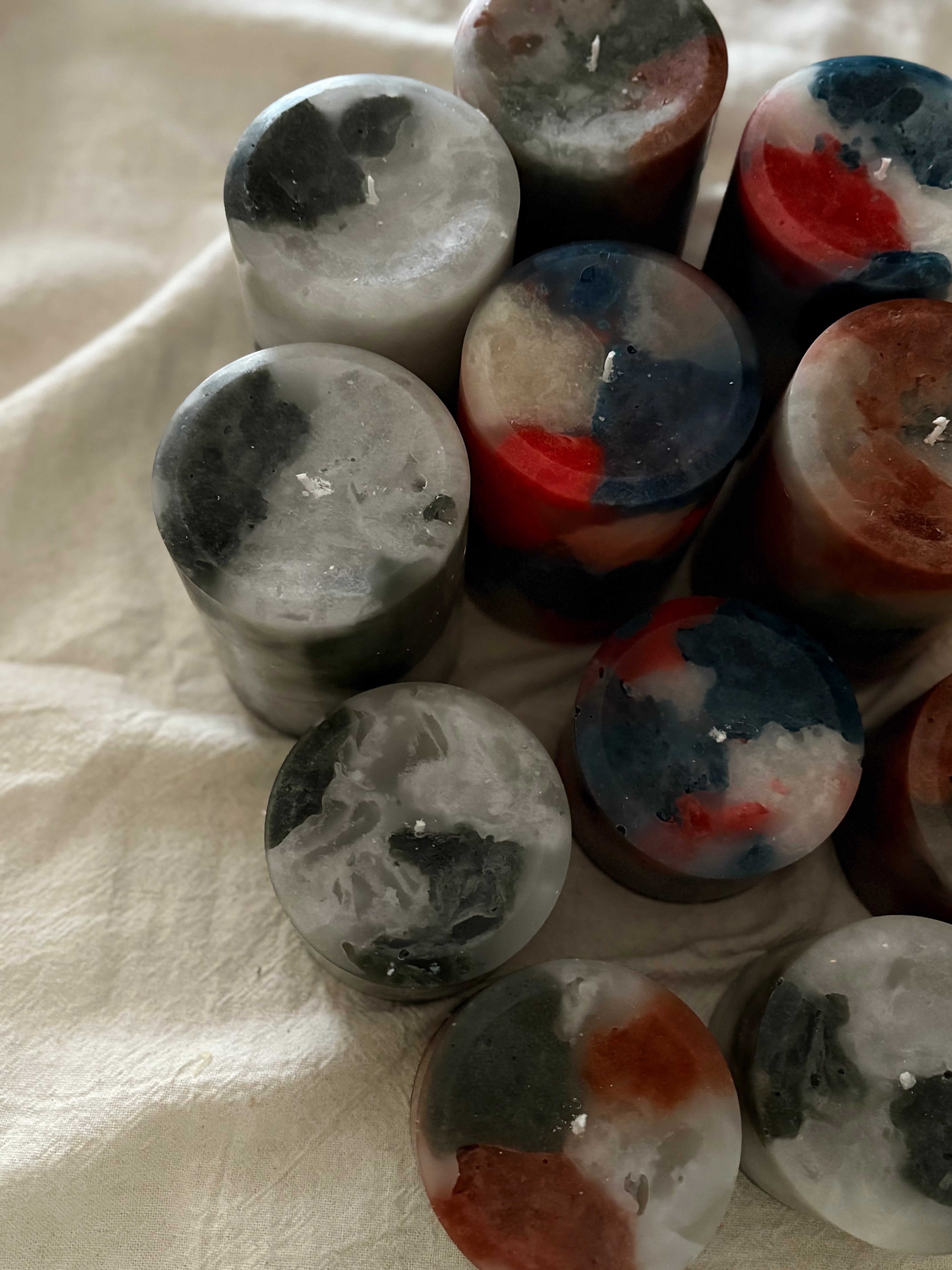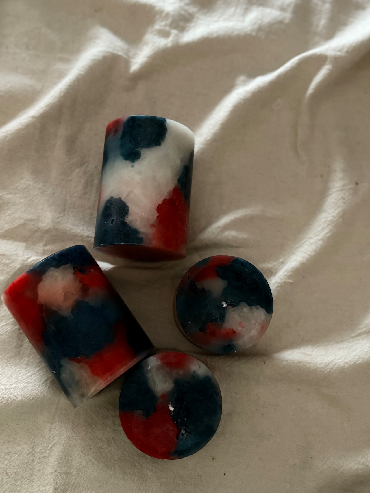 赤と紺、白を基調とした鮮やかな配色の蝋燭。円柱タイプ。