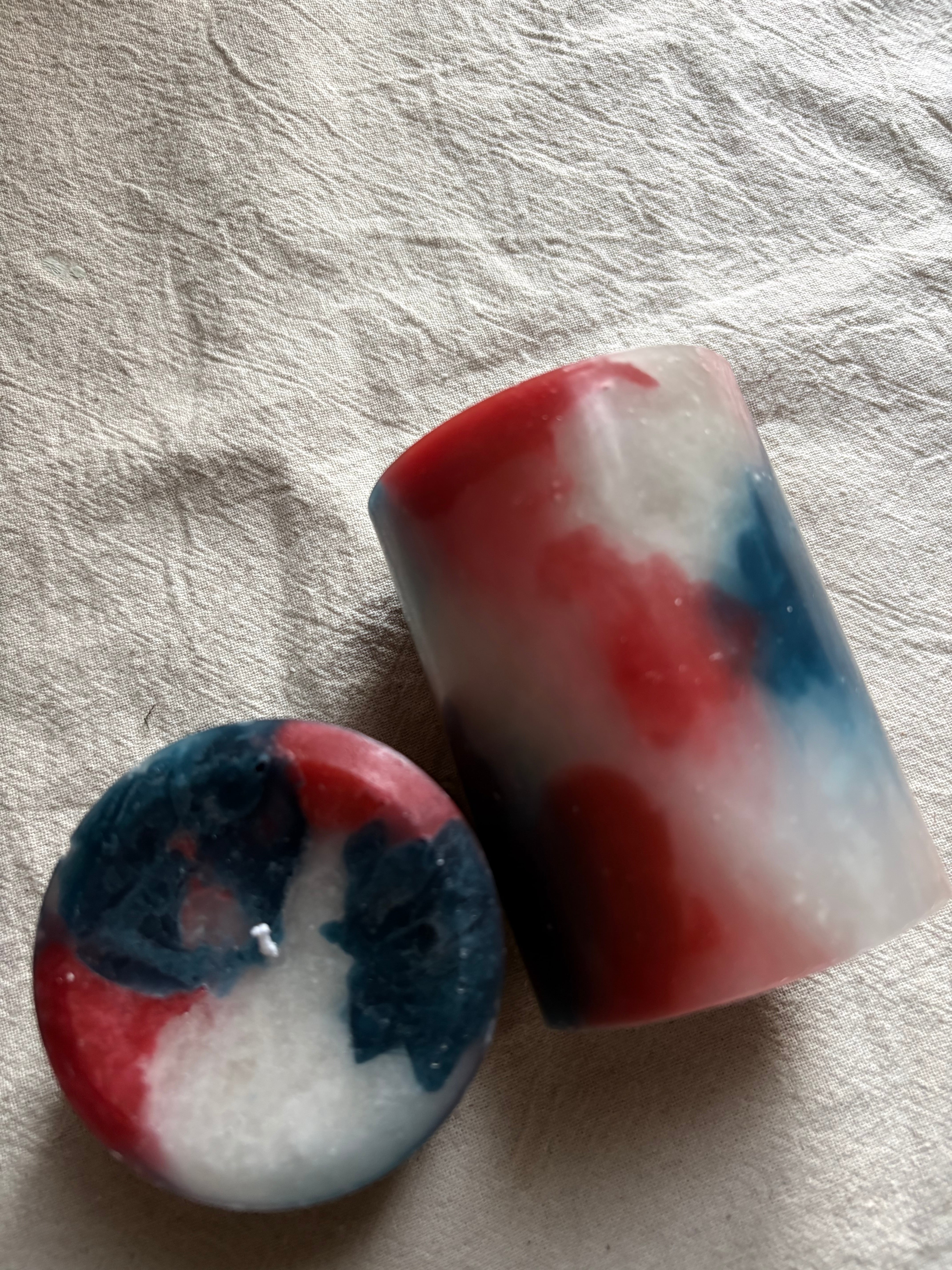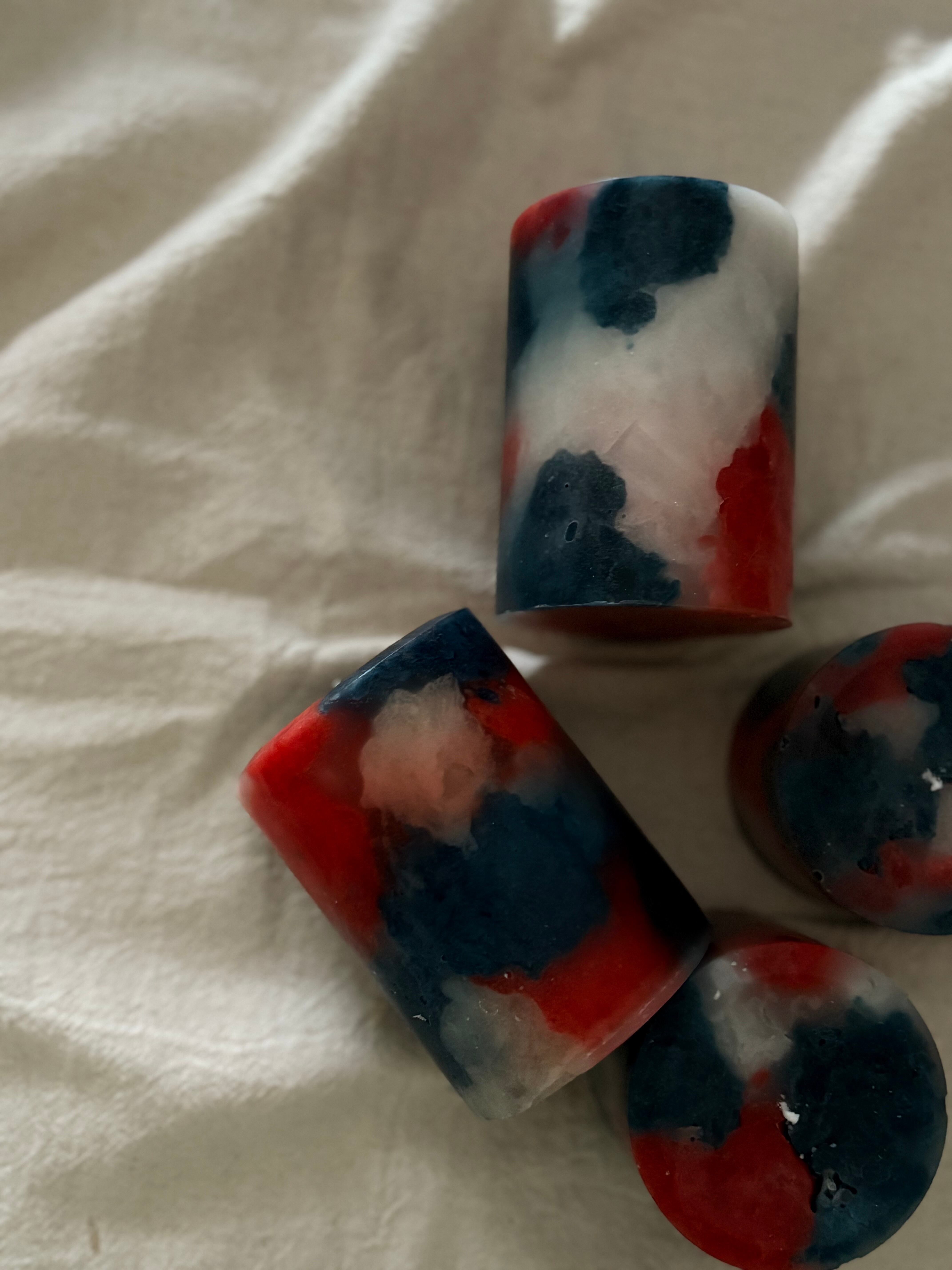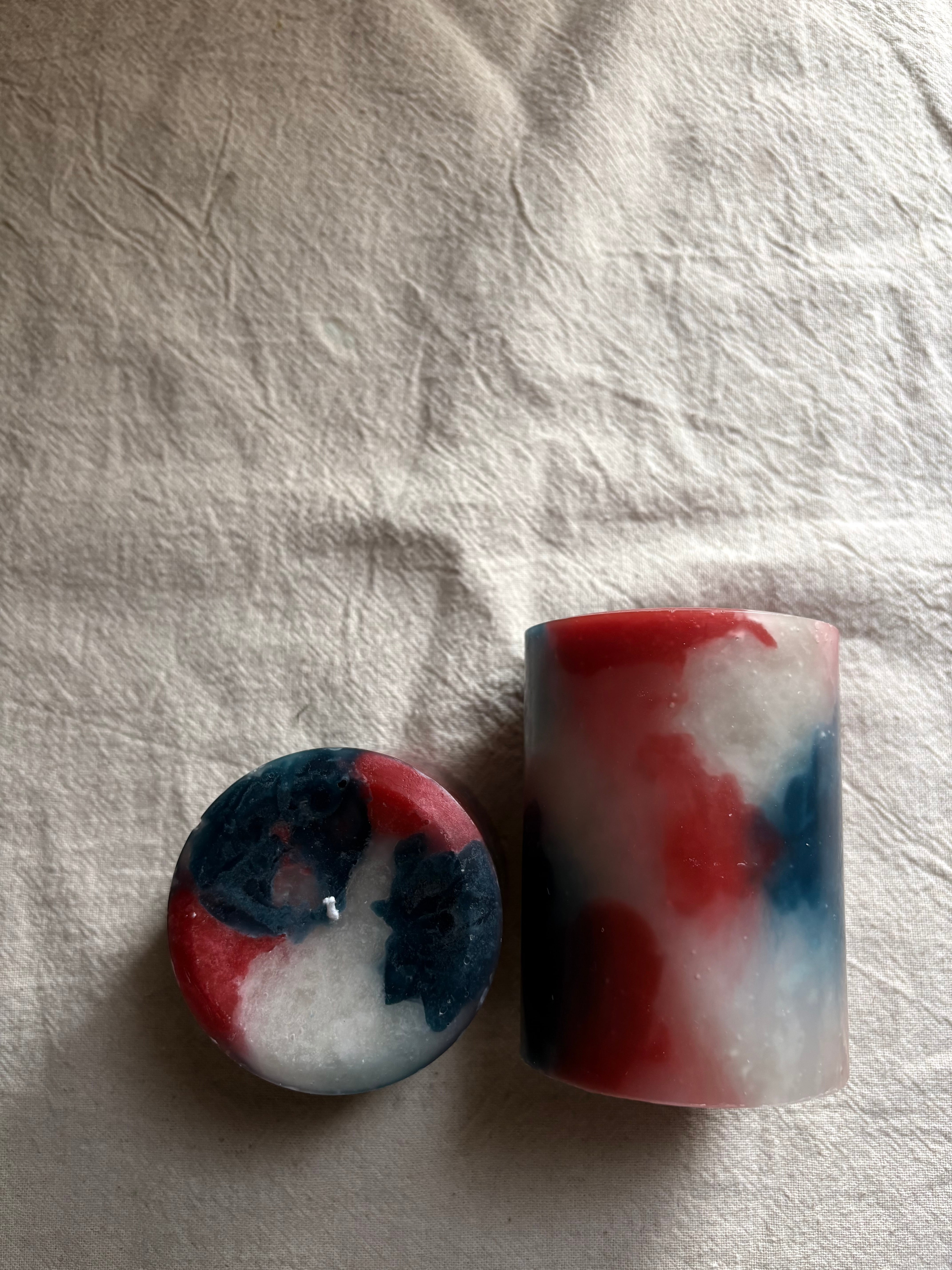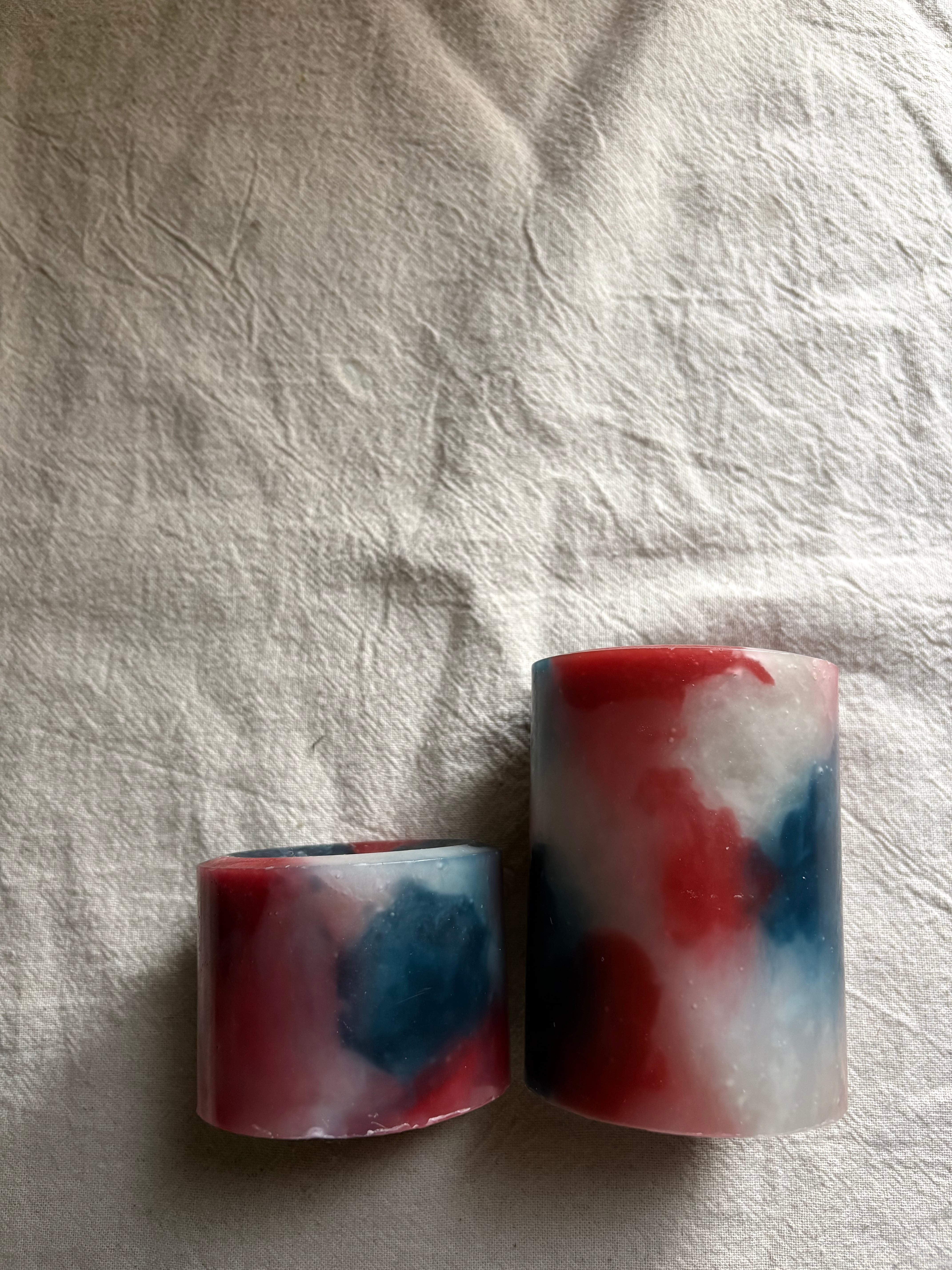 赤と紺、白を基調とした鮮やかな配色の蝋燭。円柱タイプ。