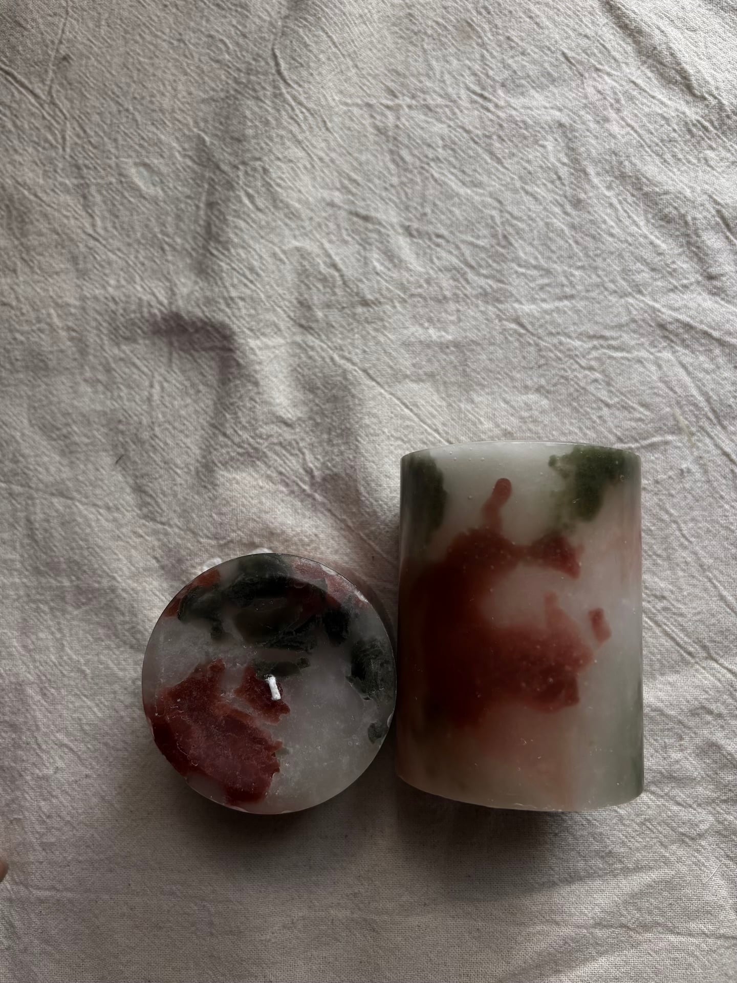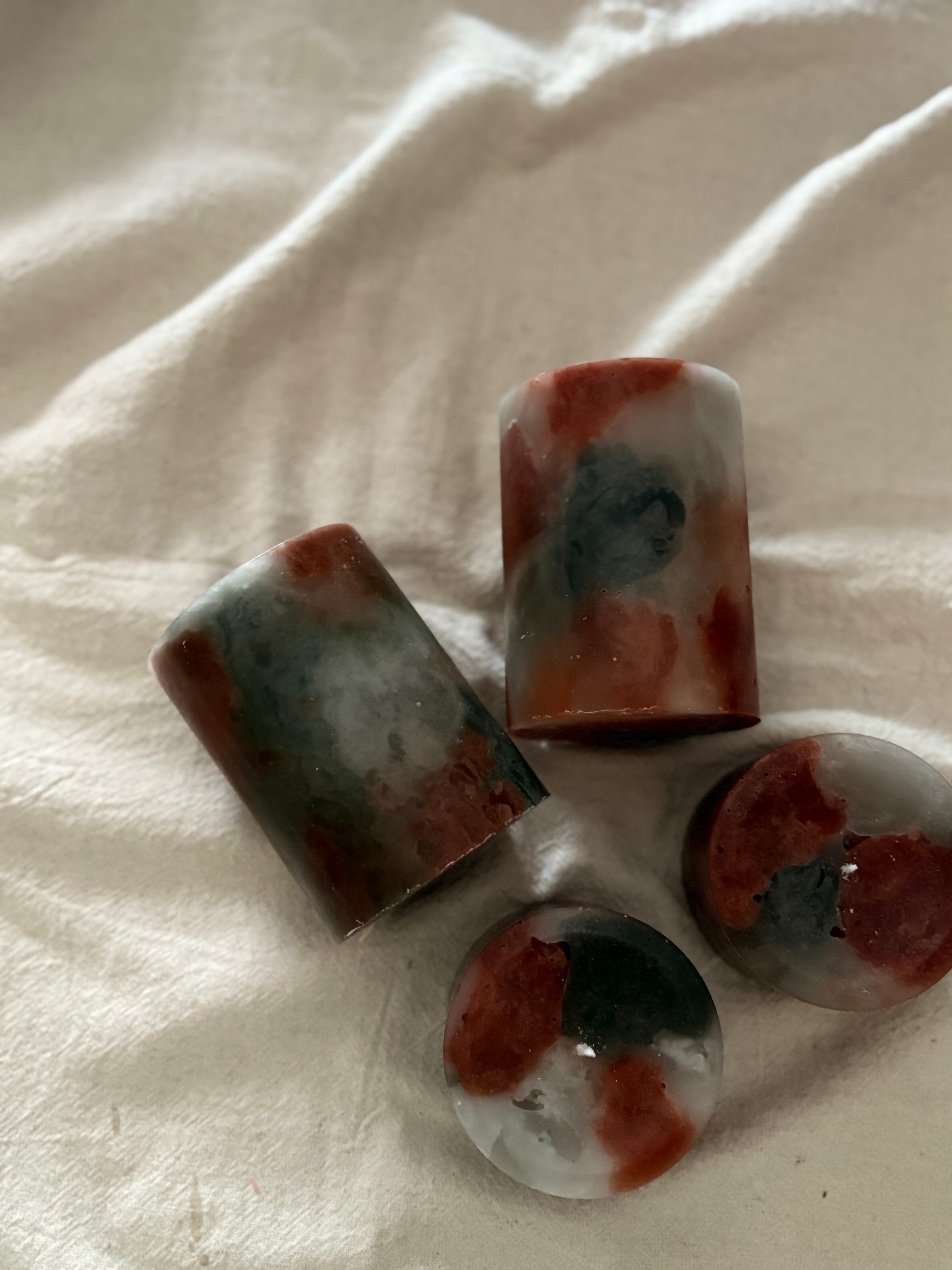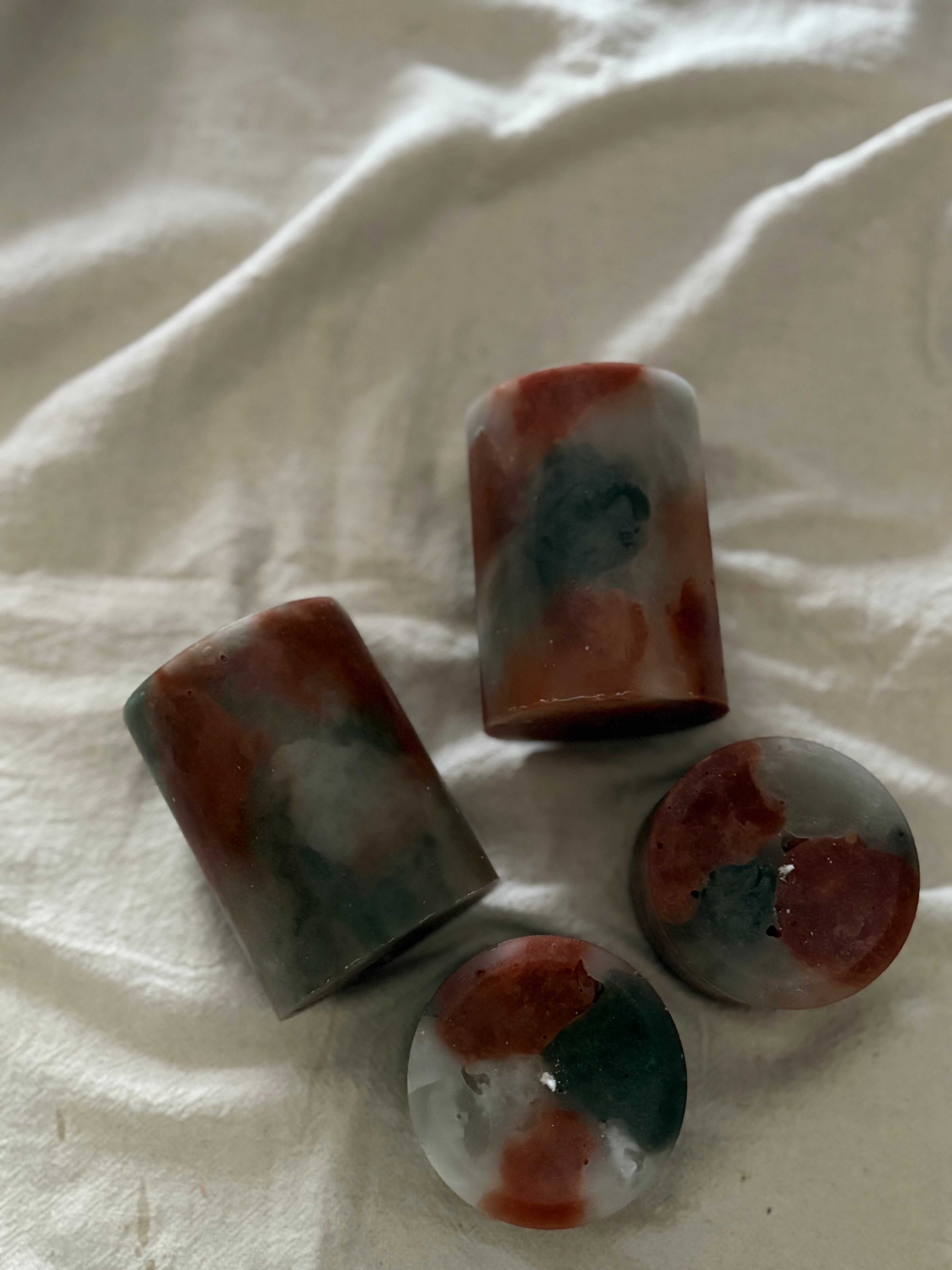 茶色、カーキ、ライトグレー基調としたアースカラーベースの配色の蝋燭。円柱タイプ。