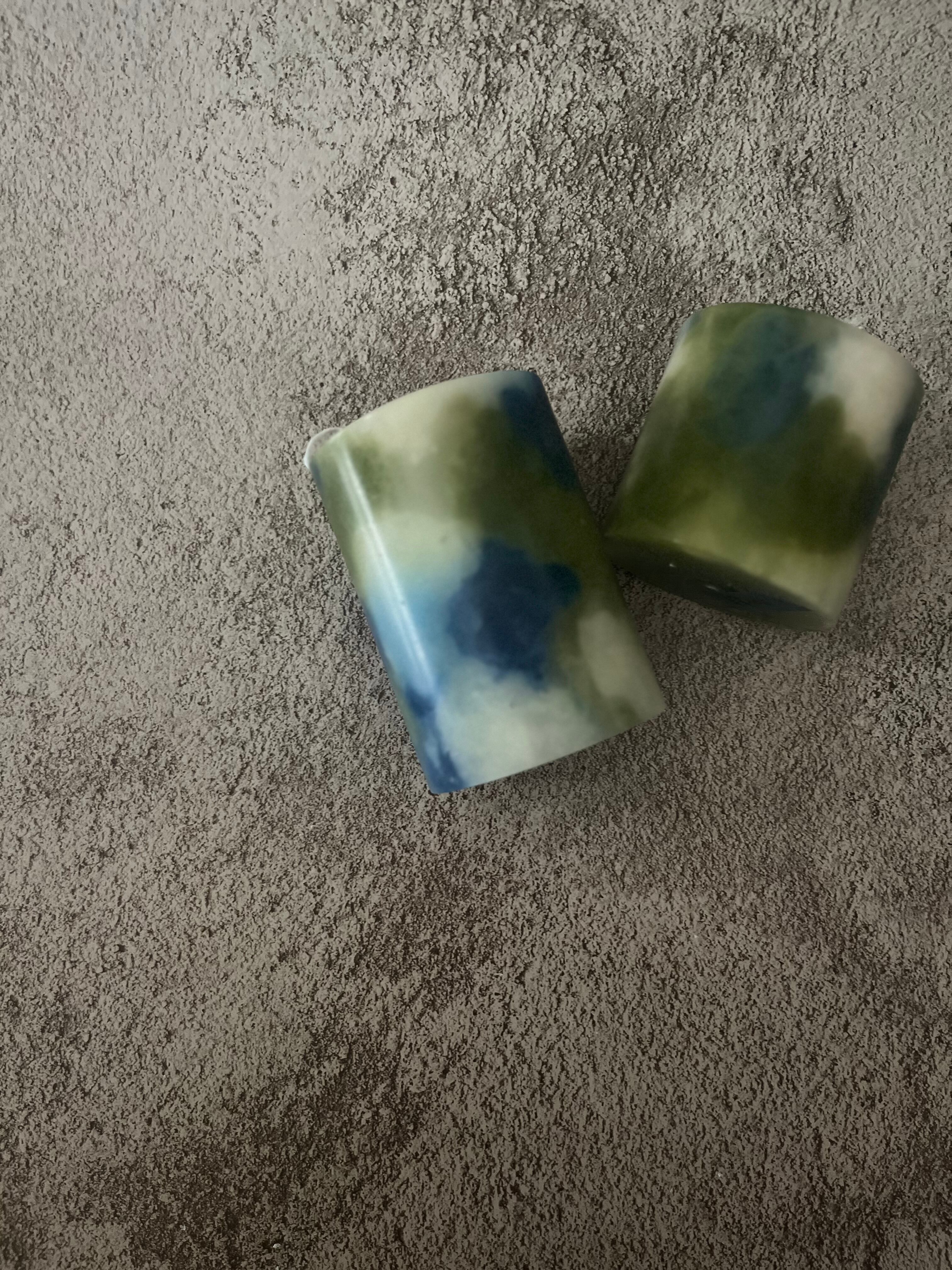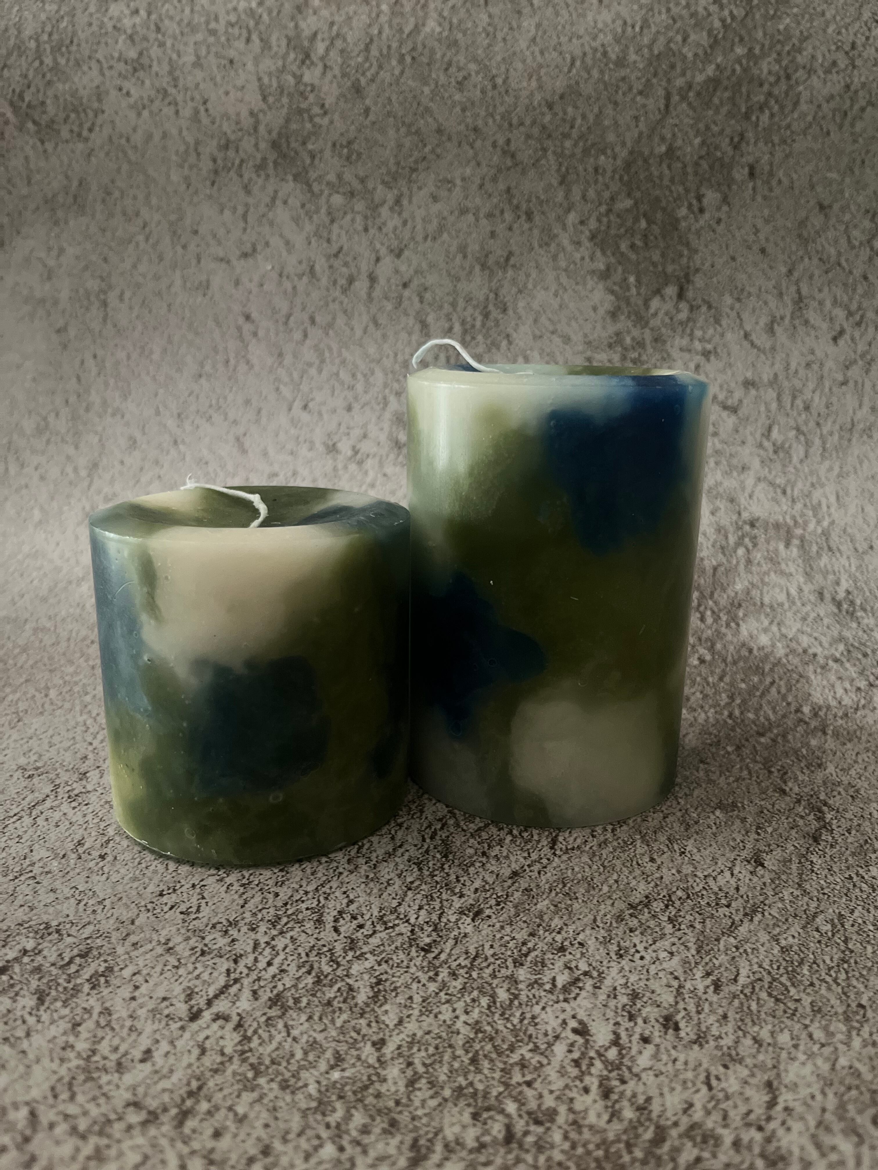 カーキ・ネイビー・アイボリーを基調とした夏らしい爽やかな配色の蝋燭。円柱タイプ。