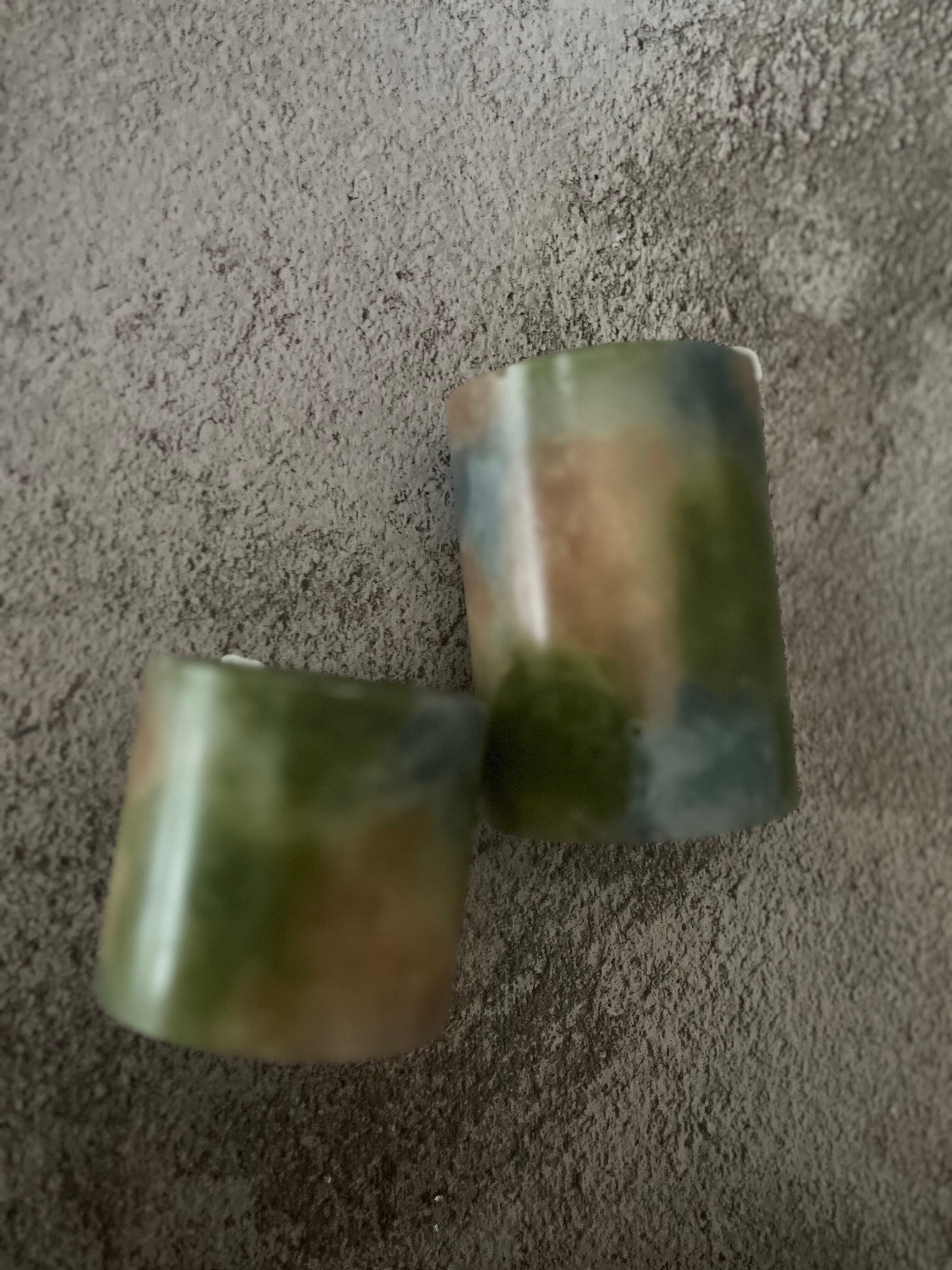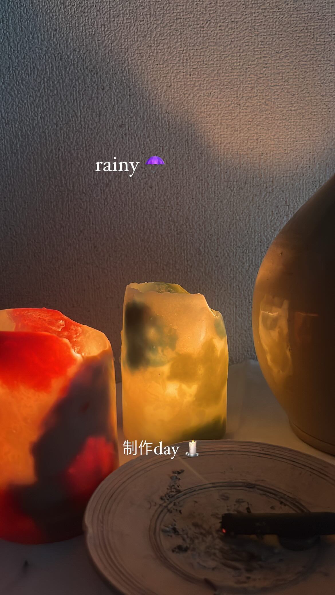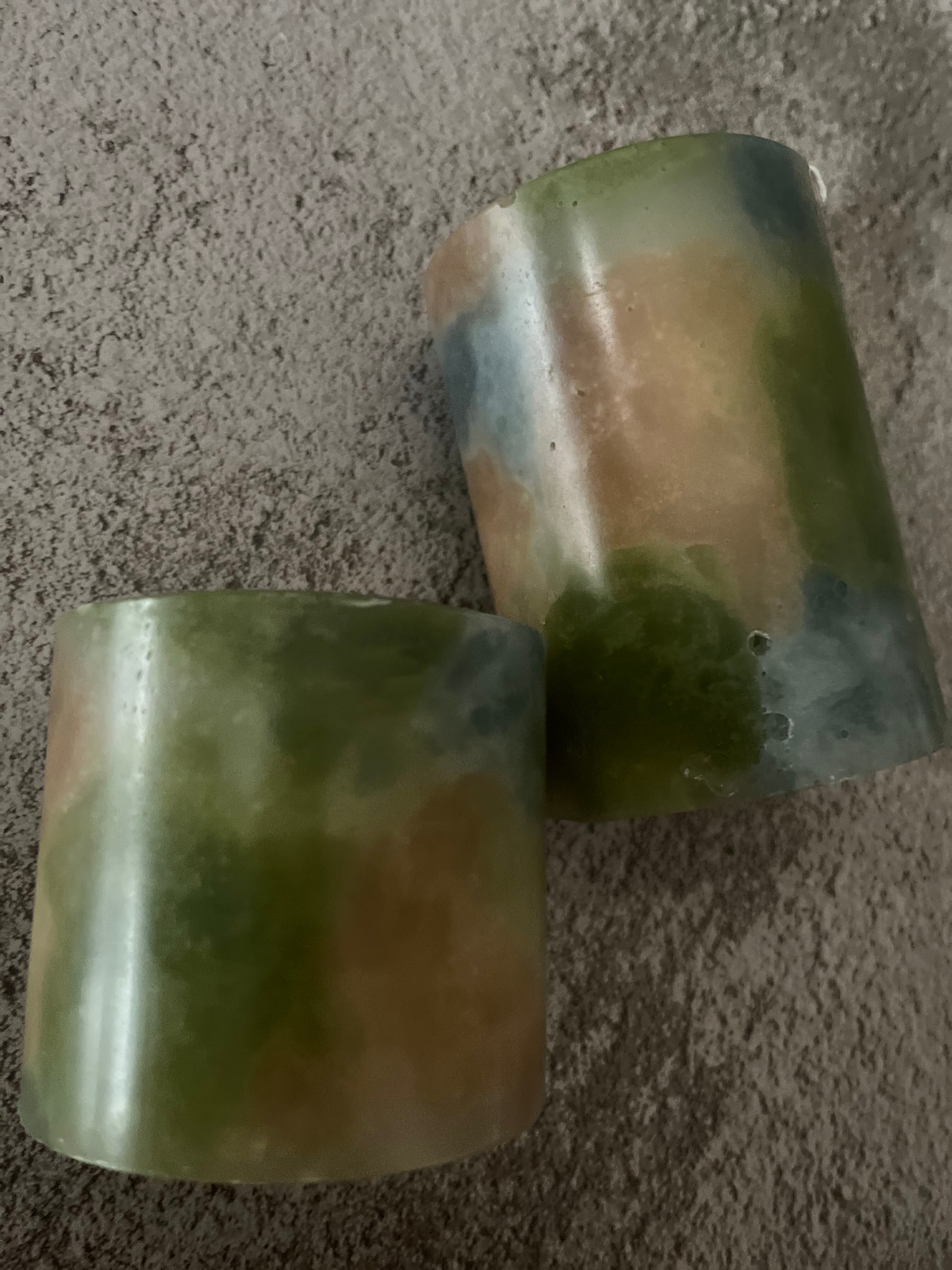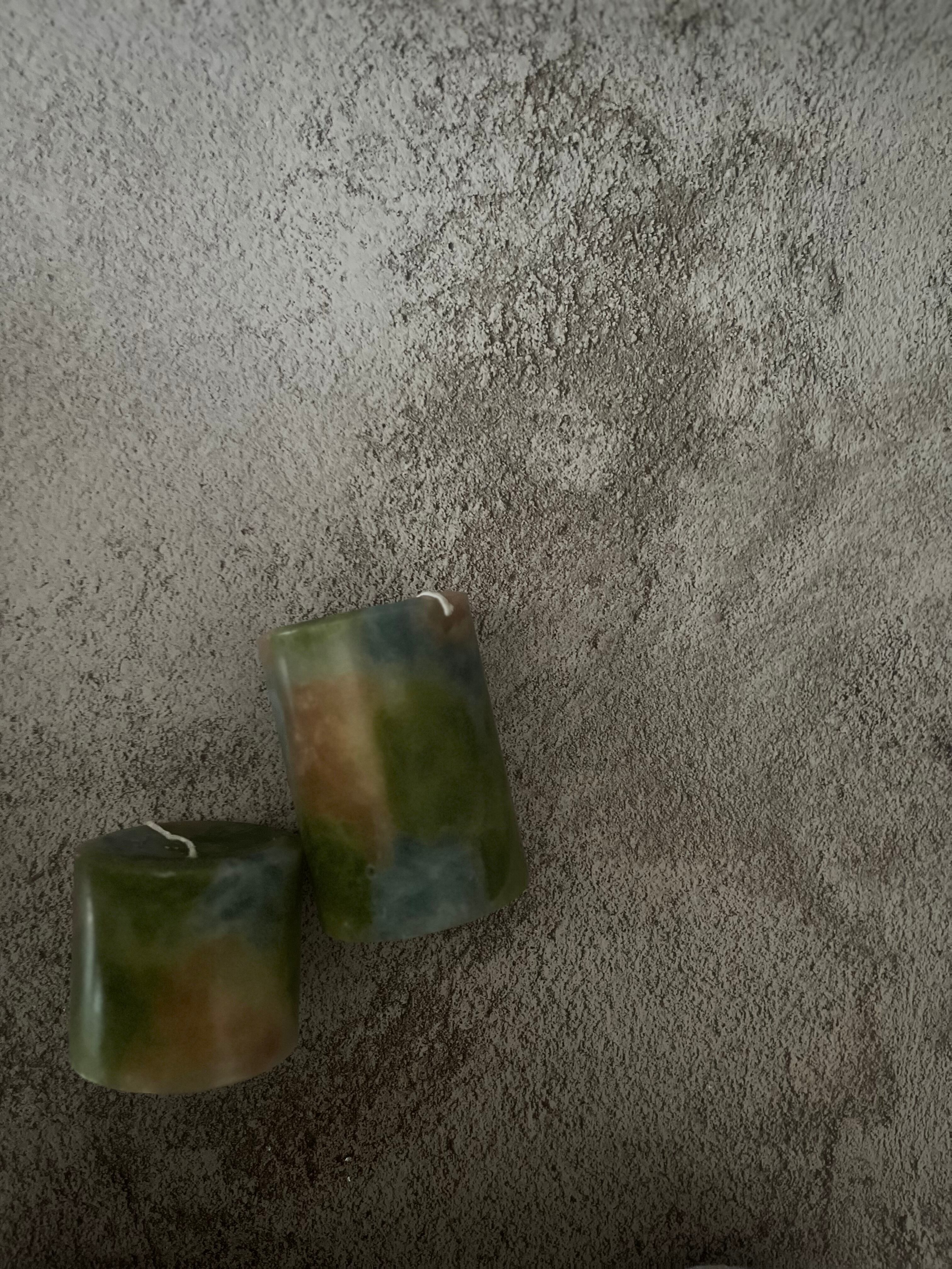 薄カーキ・バニラ・ブルーグレーを基調としたアースカラーベースの配色の蝋燭。円柱タイプ。
