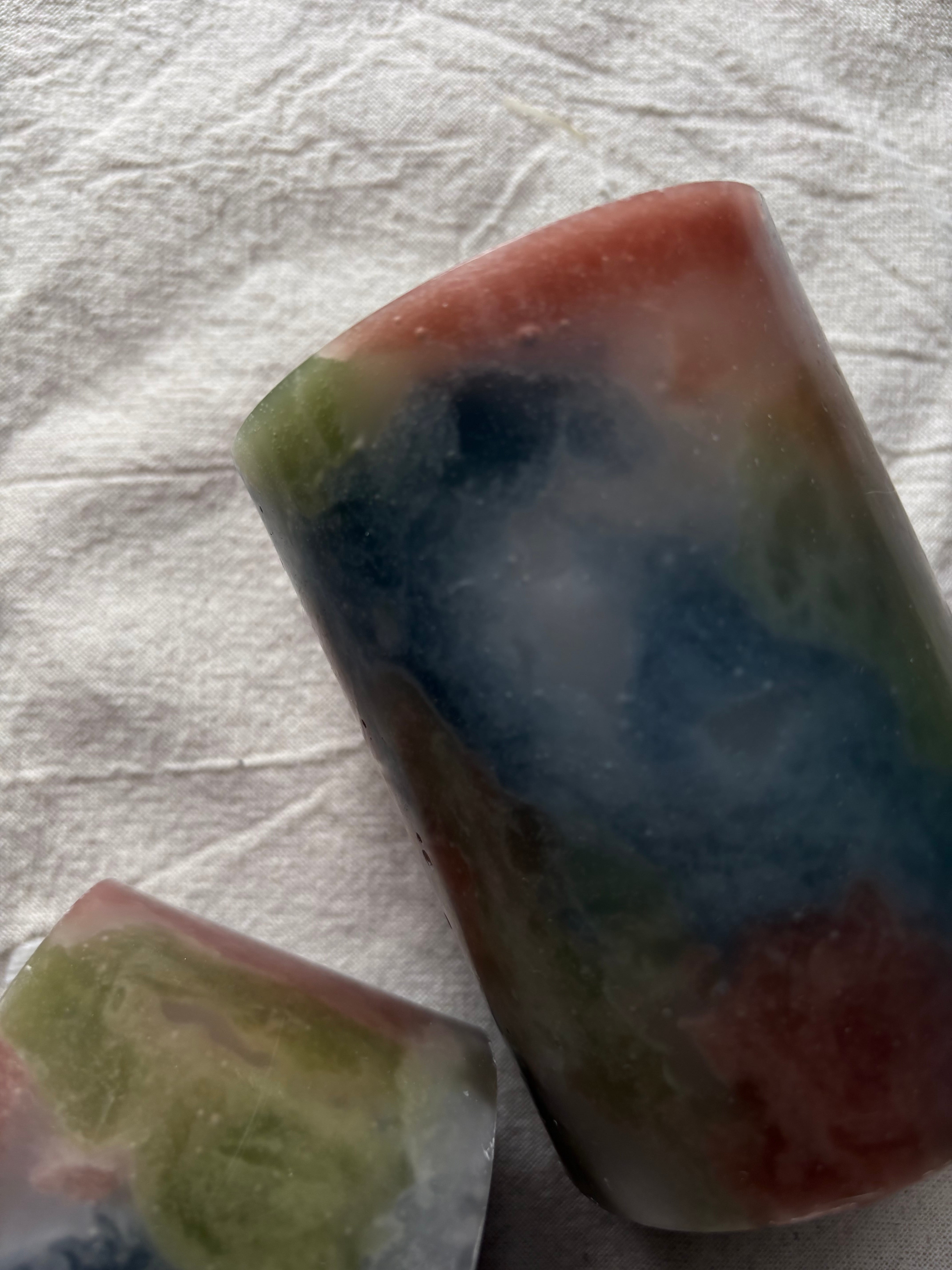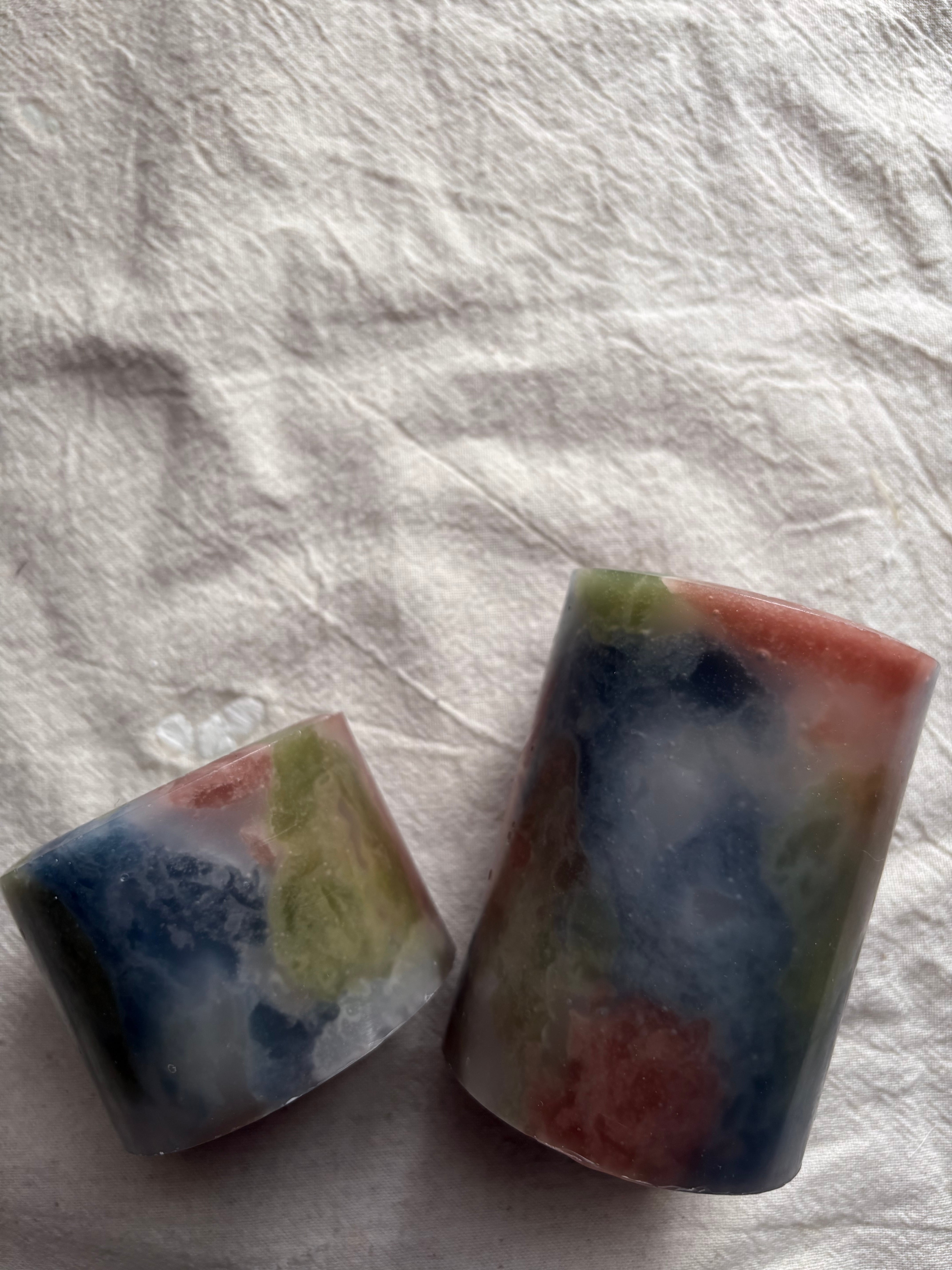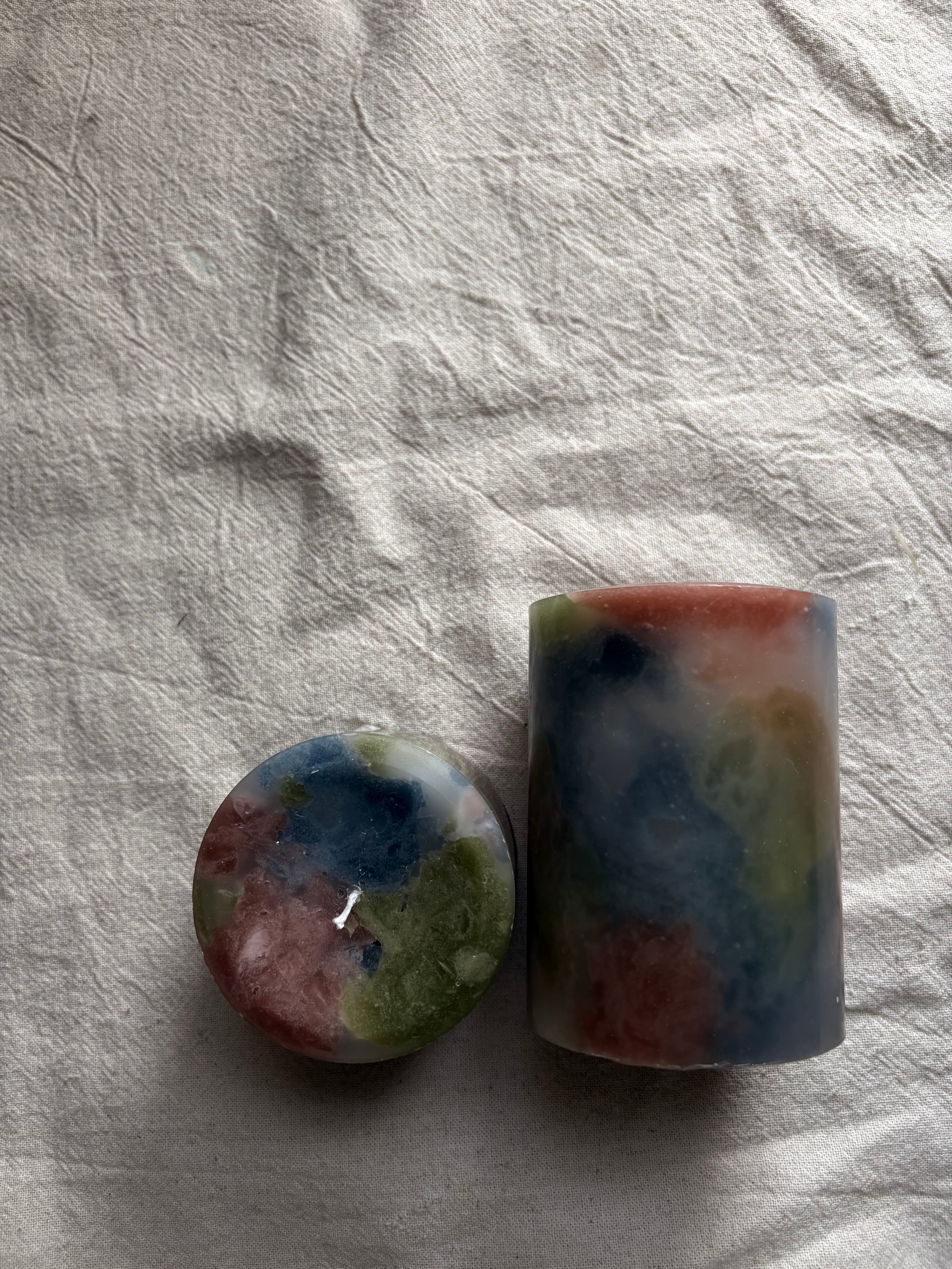 薄カーキ・ライトブルーグレー・バニラを基調としたアースカラーベースの配色の蝋燭。円柱タイプ。