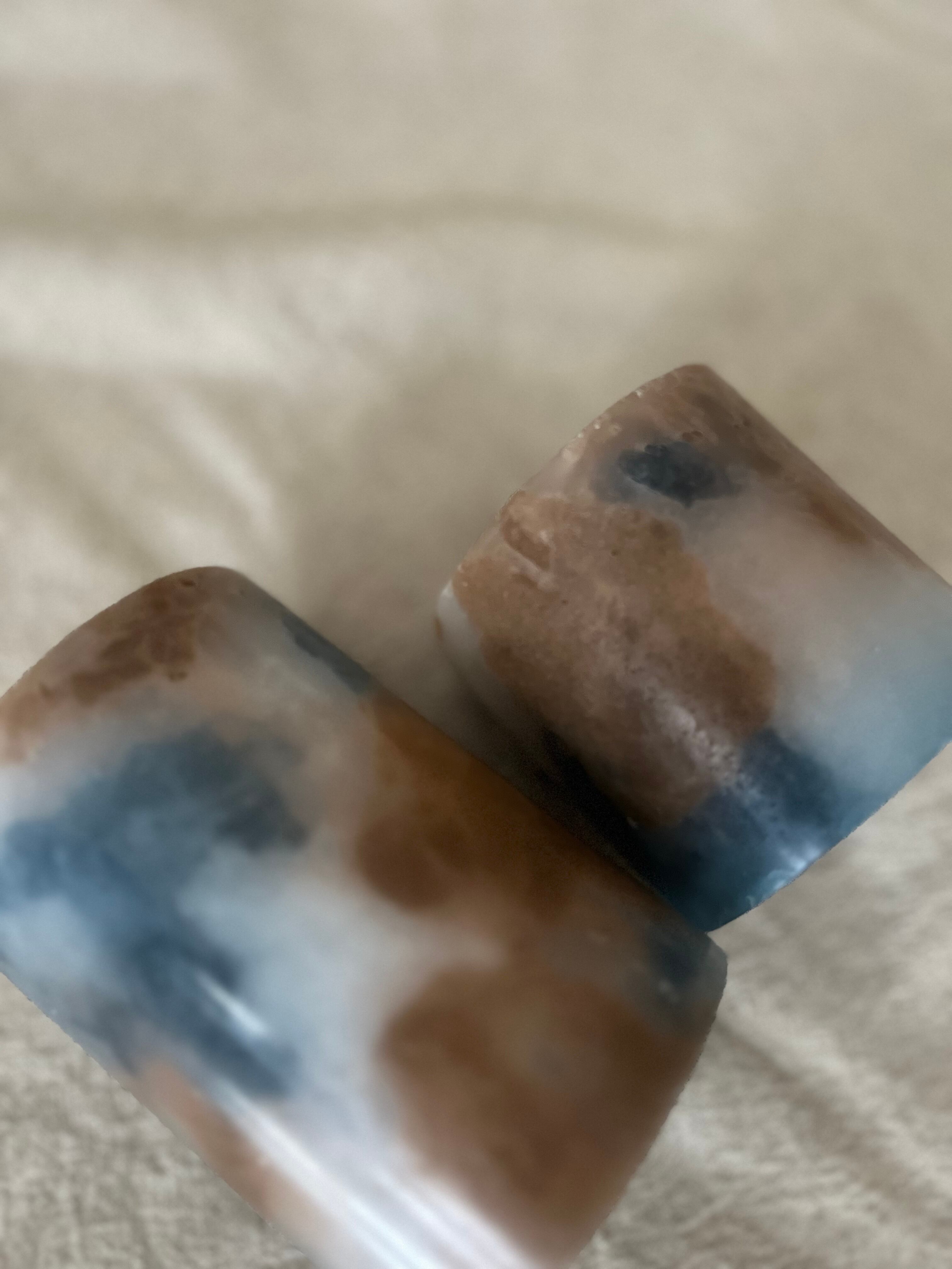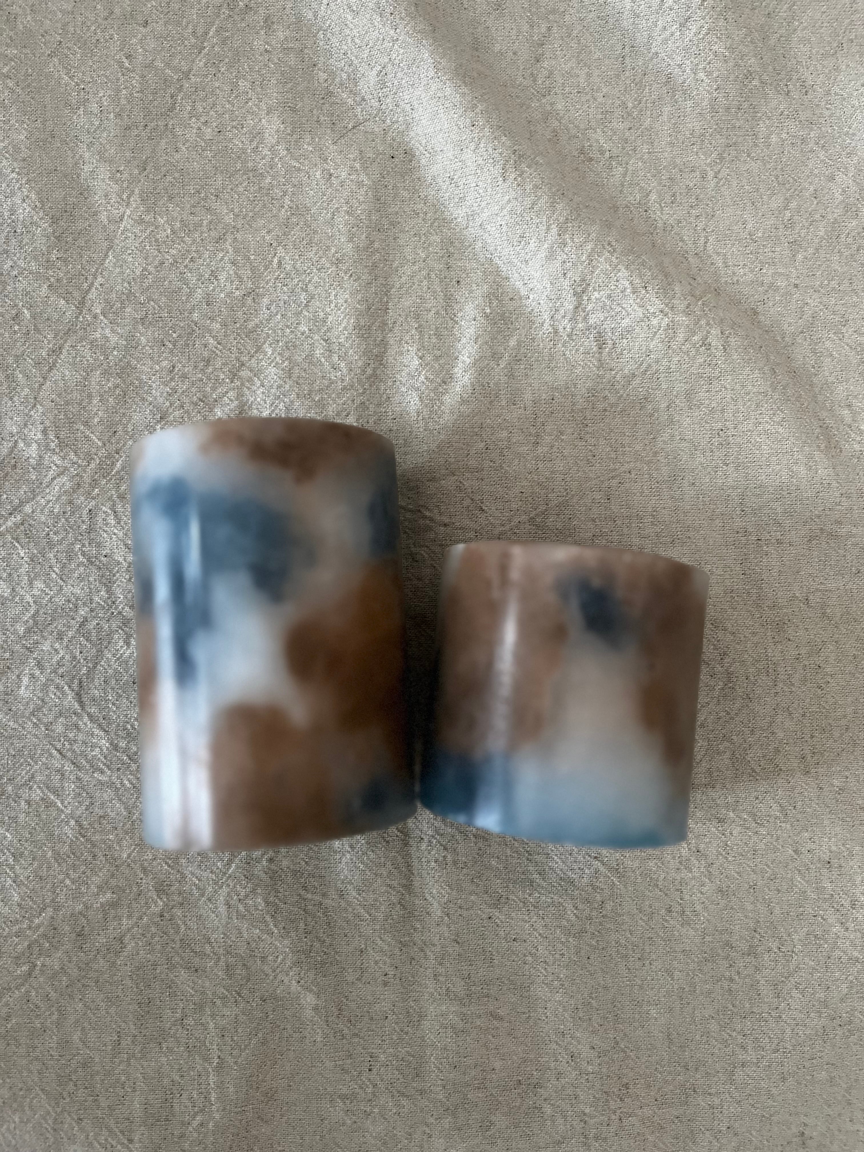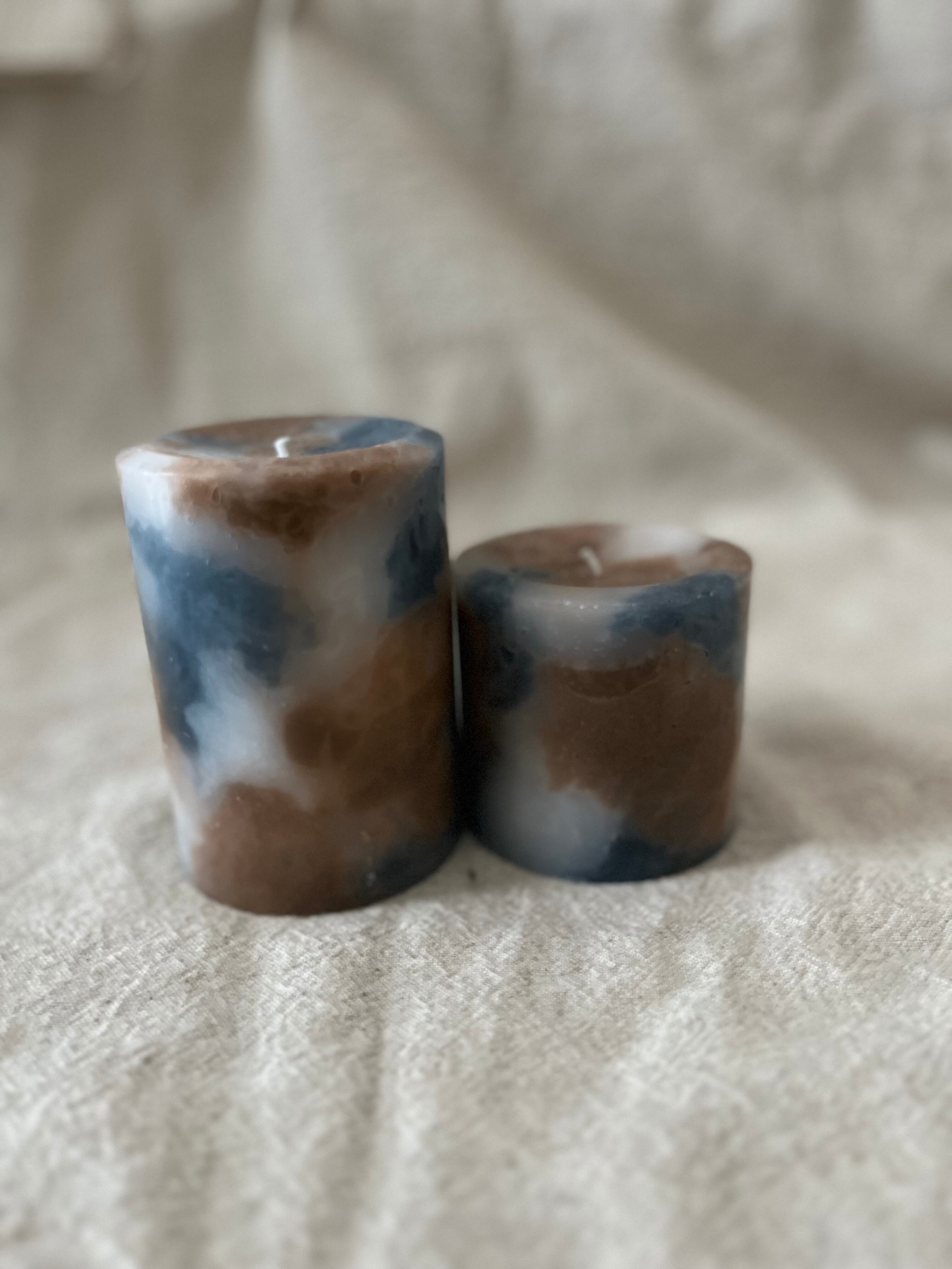 薄茶色・ネイビー・白を基調としたアースカラーベースの配色の蝋燭。円柱タイプ。