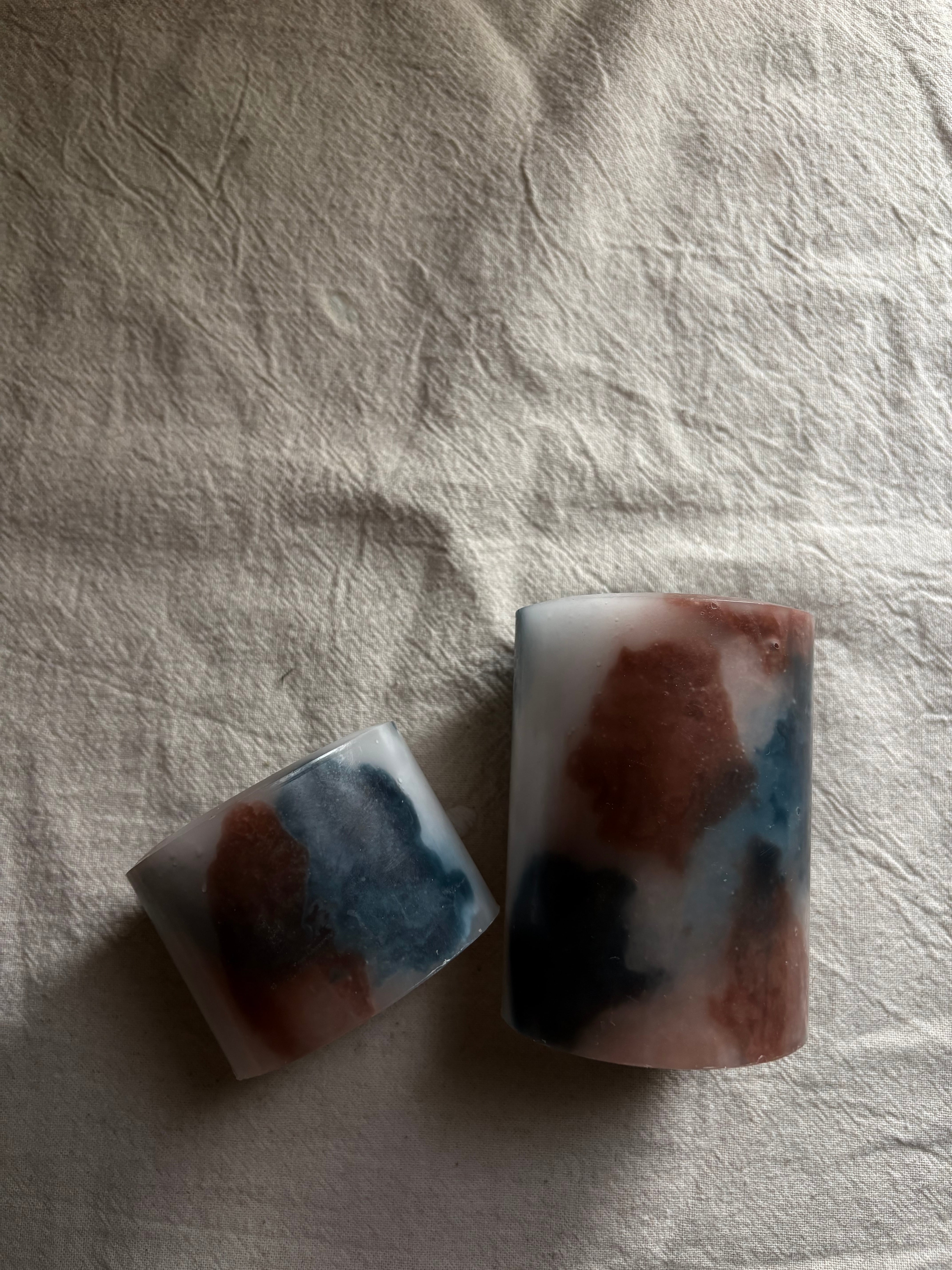 茶色・ネイビー・白を基調としたアースカラーベースの配色の蝋燭。円柱タイプ。