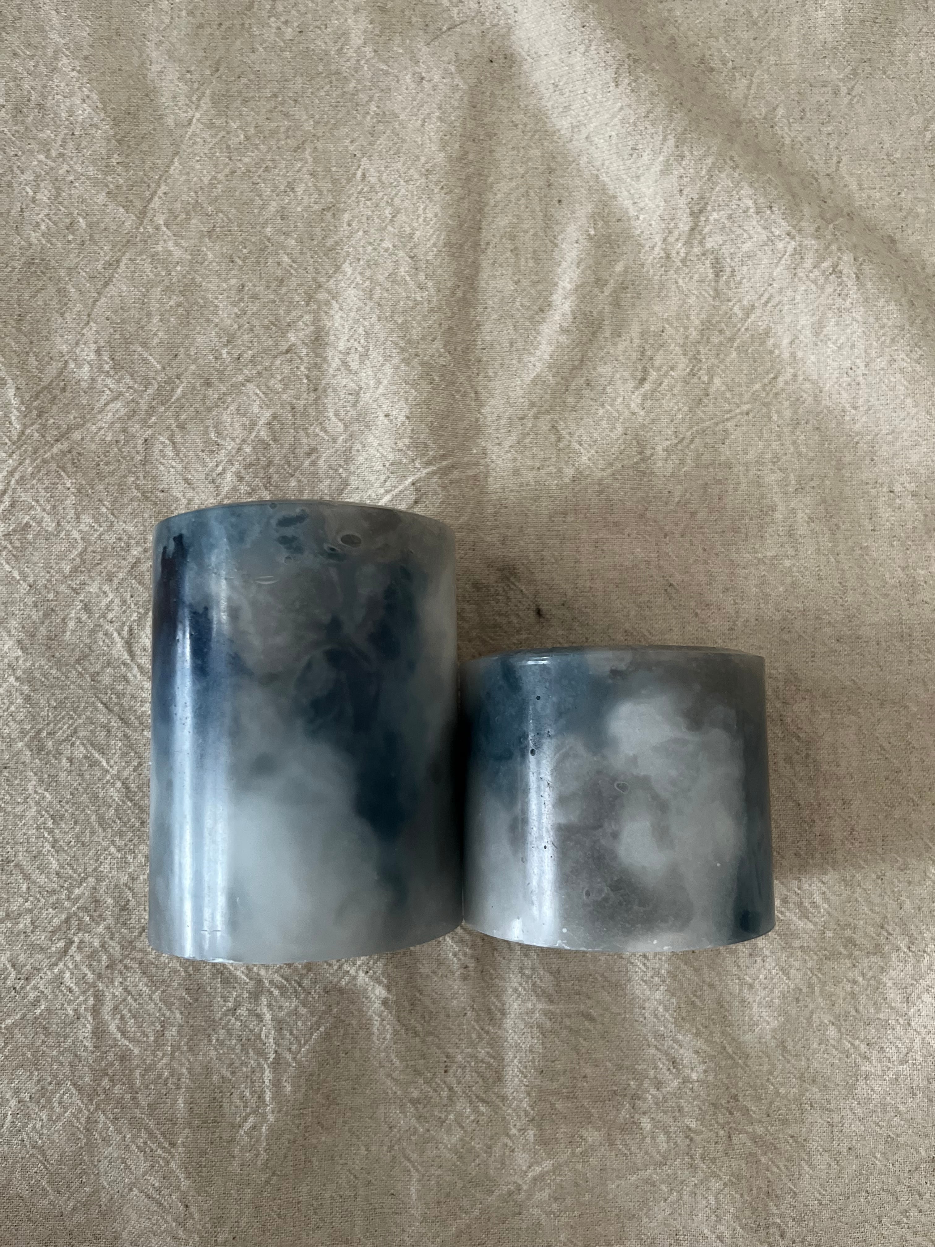 ライトグレー・ネイビー・白を基調とした寒色系ベースの配色の蝋燭。円柱タイプ。