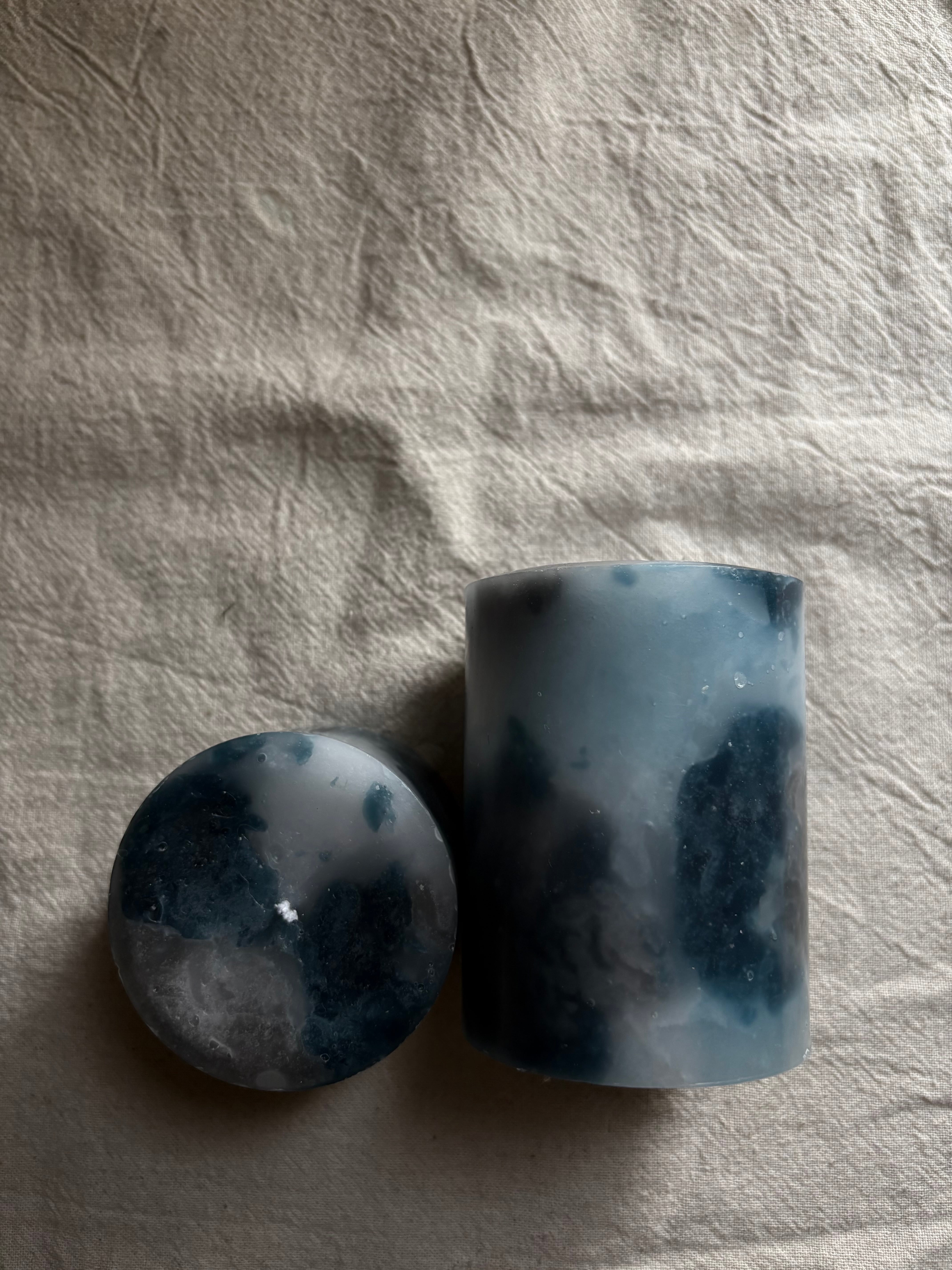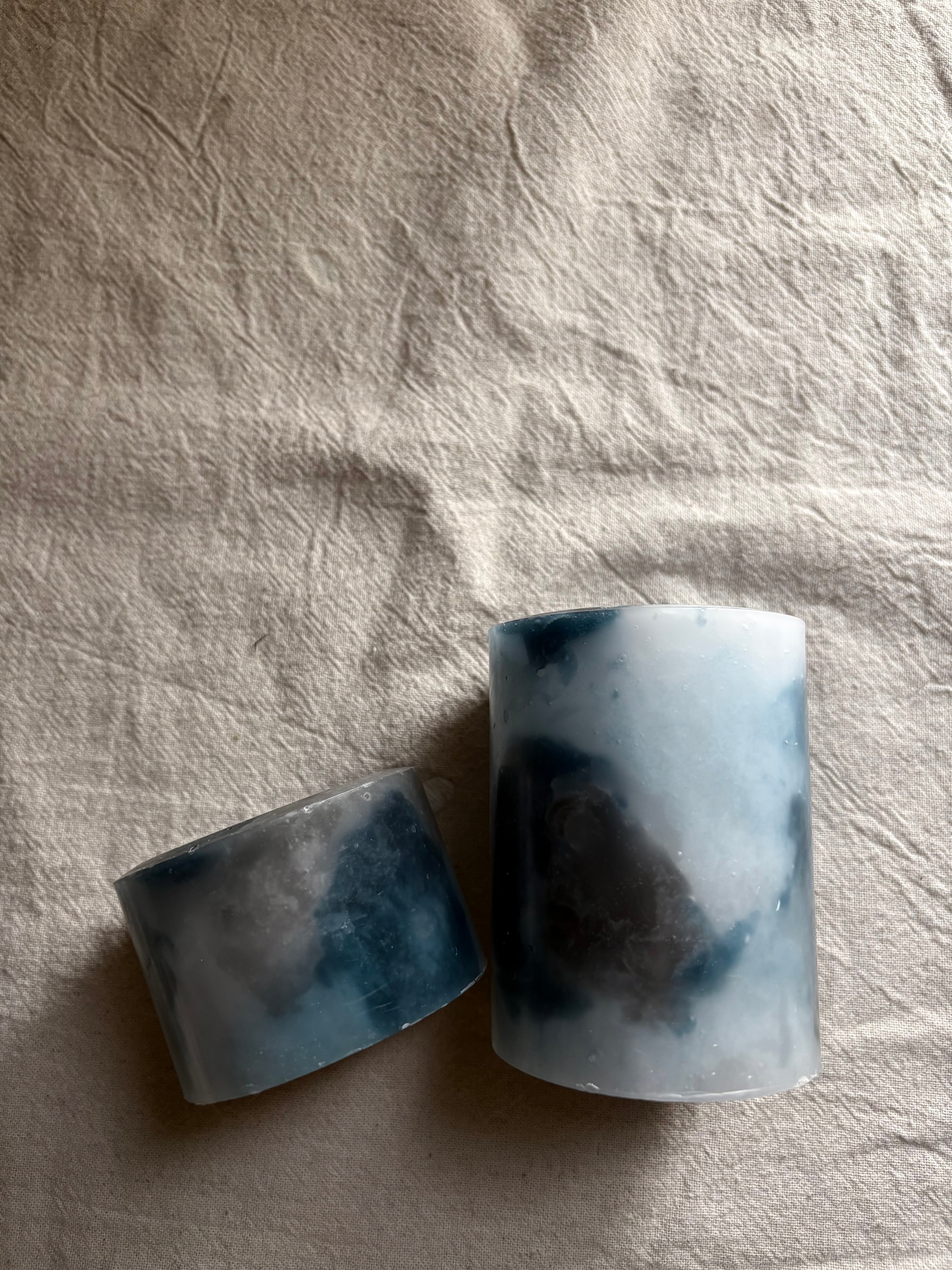 ライトグレー・ネイビー・白を基調とした寒色系の配色の蝋燭。円柱タイプ。