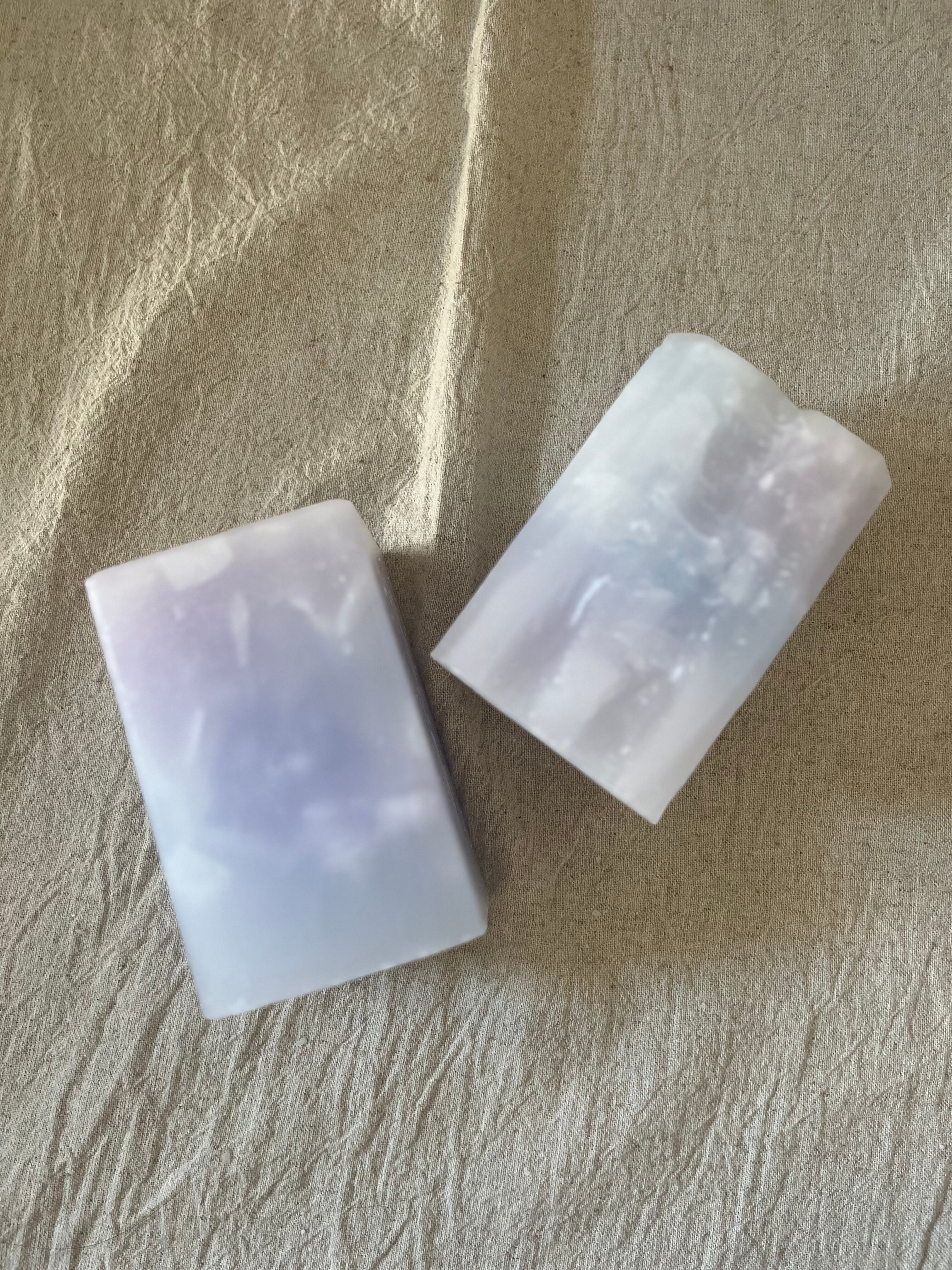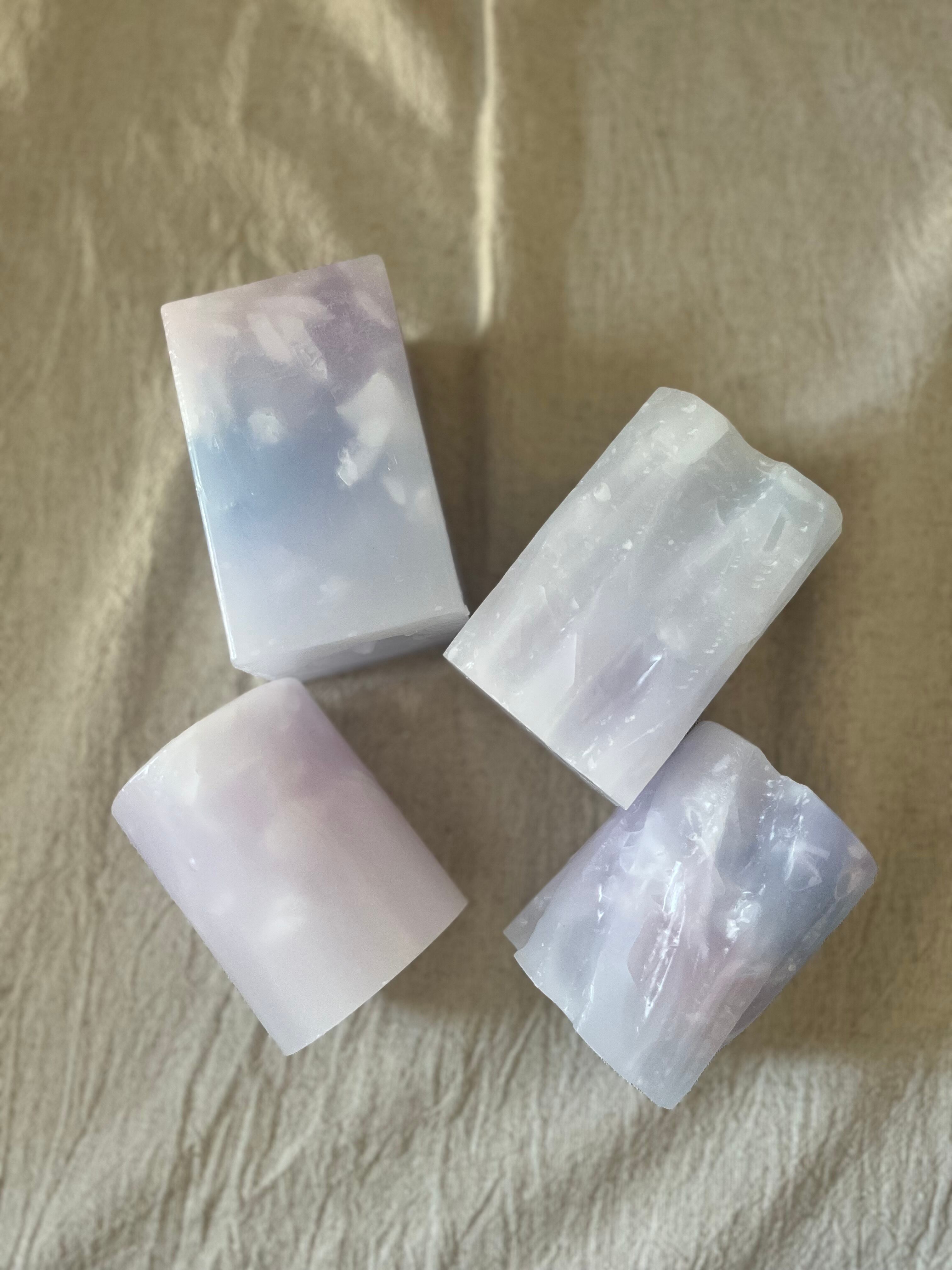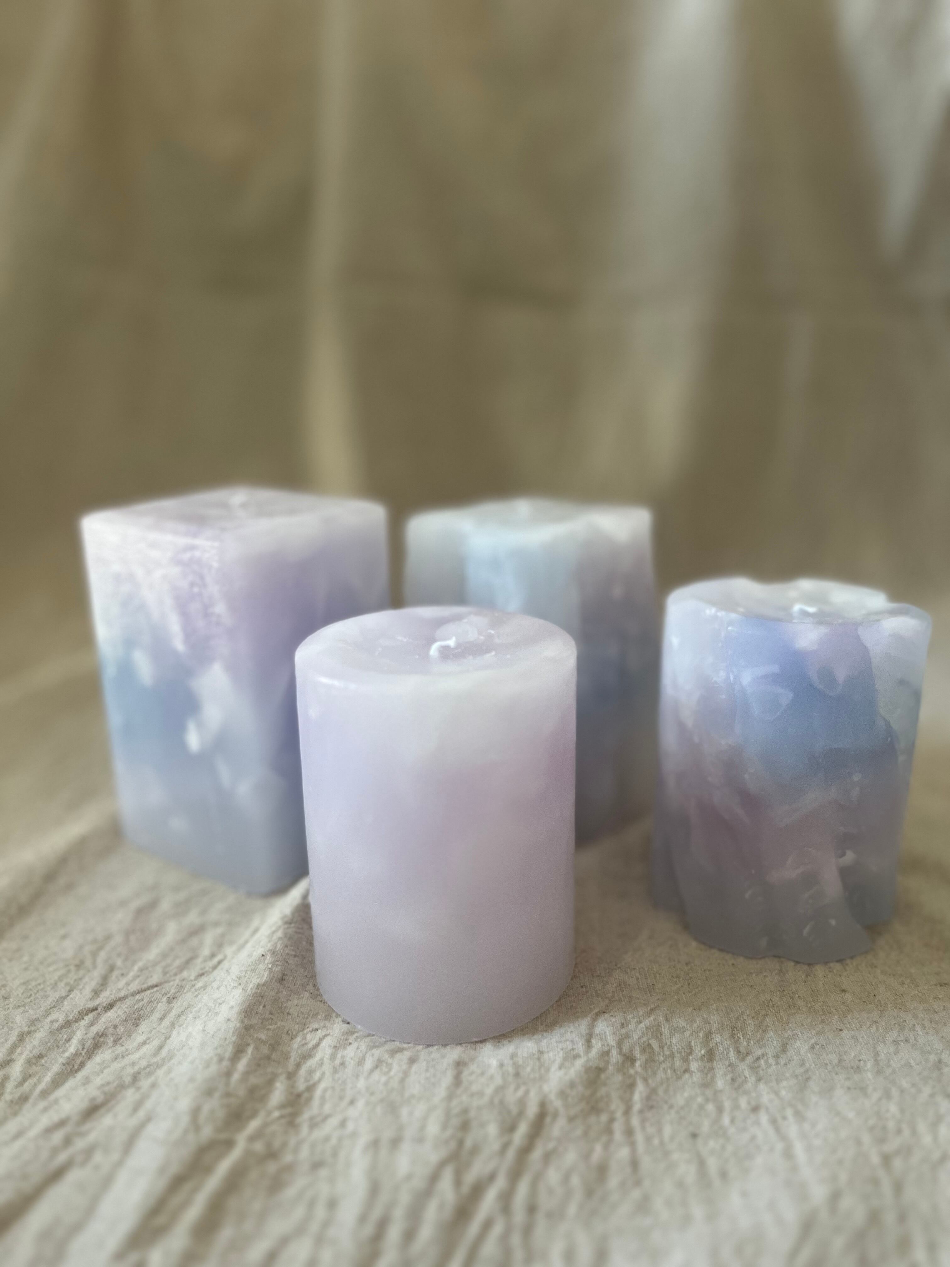 淡いブルー・パープルの色味が織りなす透明感が美しい蝋燭、絖-KOU- 03 四角柱タイプ。